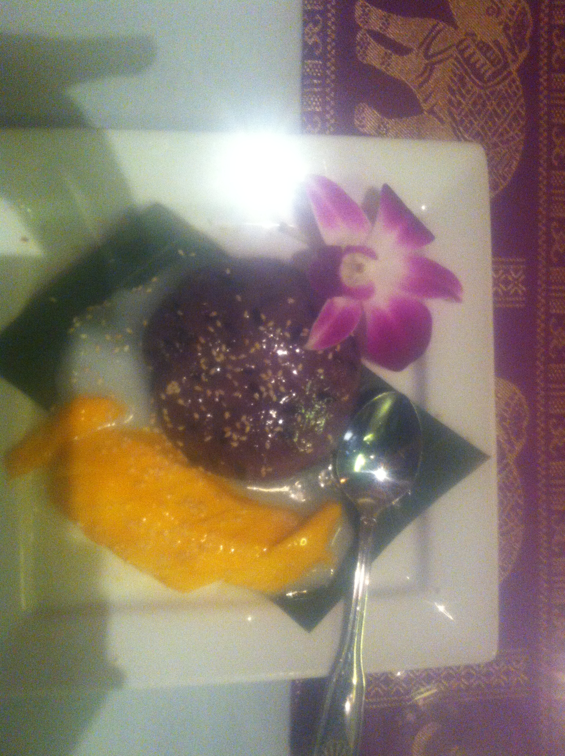 Mango Sticky Rice       This pic doesn’t begin to do it justice.  It was so lovely, just to look at.  I had never seen a real, live orchid before.  In fact, I had to ask what kind of flower it was, just to be sure.  I also ask what the green leaf underneath was–banana leaf.  I had never had the sticky brown rice like that before either.  Both the rice and the mango was covered with a thin, white, subtly sweet sauce.  The whole thing was delicious!  I ate it all and told them I would come back sometime for lunch.